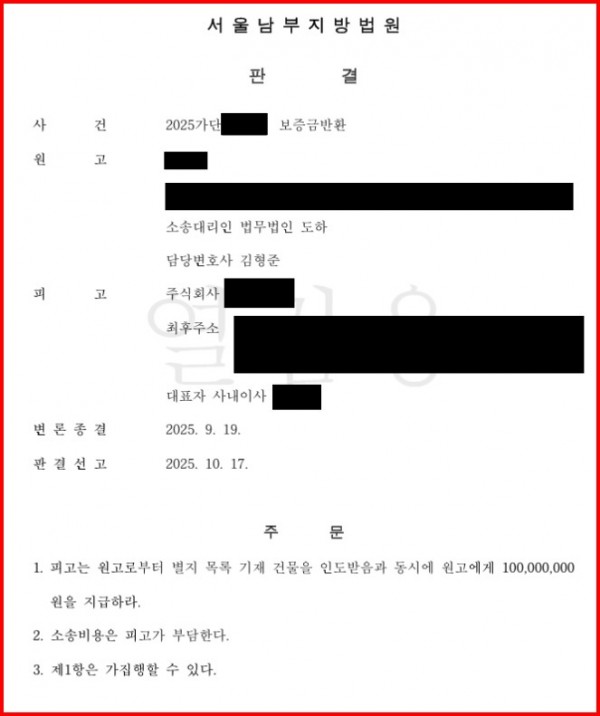 임대보증금반환청구 소송에서 임대차계약이 적법하게 종료되었다는 점, 전세사기 피해자 양산 가능성이 있다는 점 등을 재판부에 강력하게 어필하였고, 결국 법원으로부터 임대보증금 1억원 전액을 반환하라는 판단을 받아 강제집행을 위한 초석을 마련할 수 있었습니다.