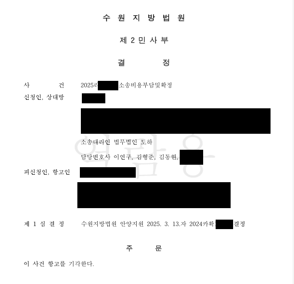 이에 따라 의뢰인은 소송비용 전액을 피신청인에게 부담시키는 결정을 최종적으로 확정받았습니다.
